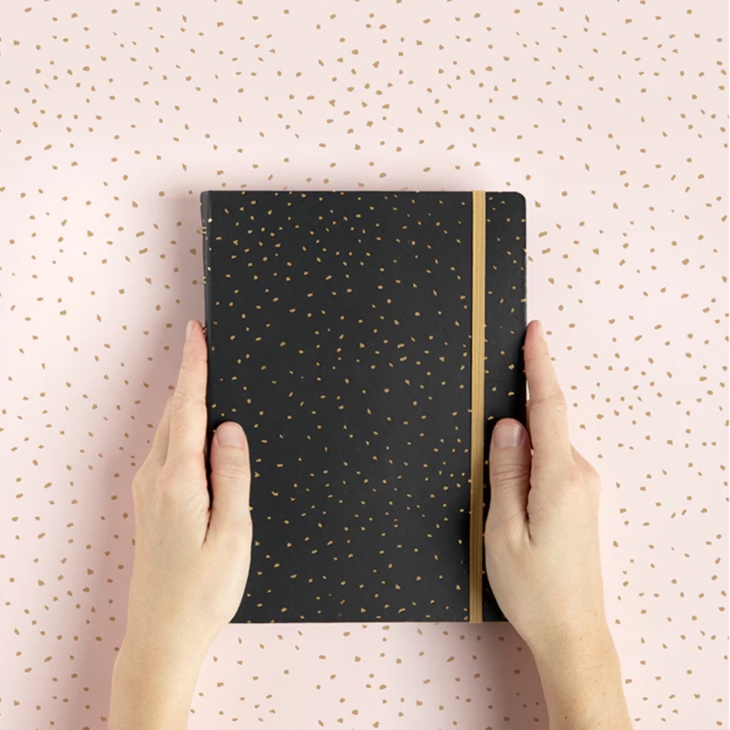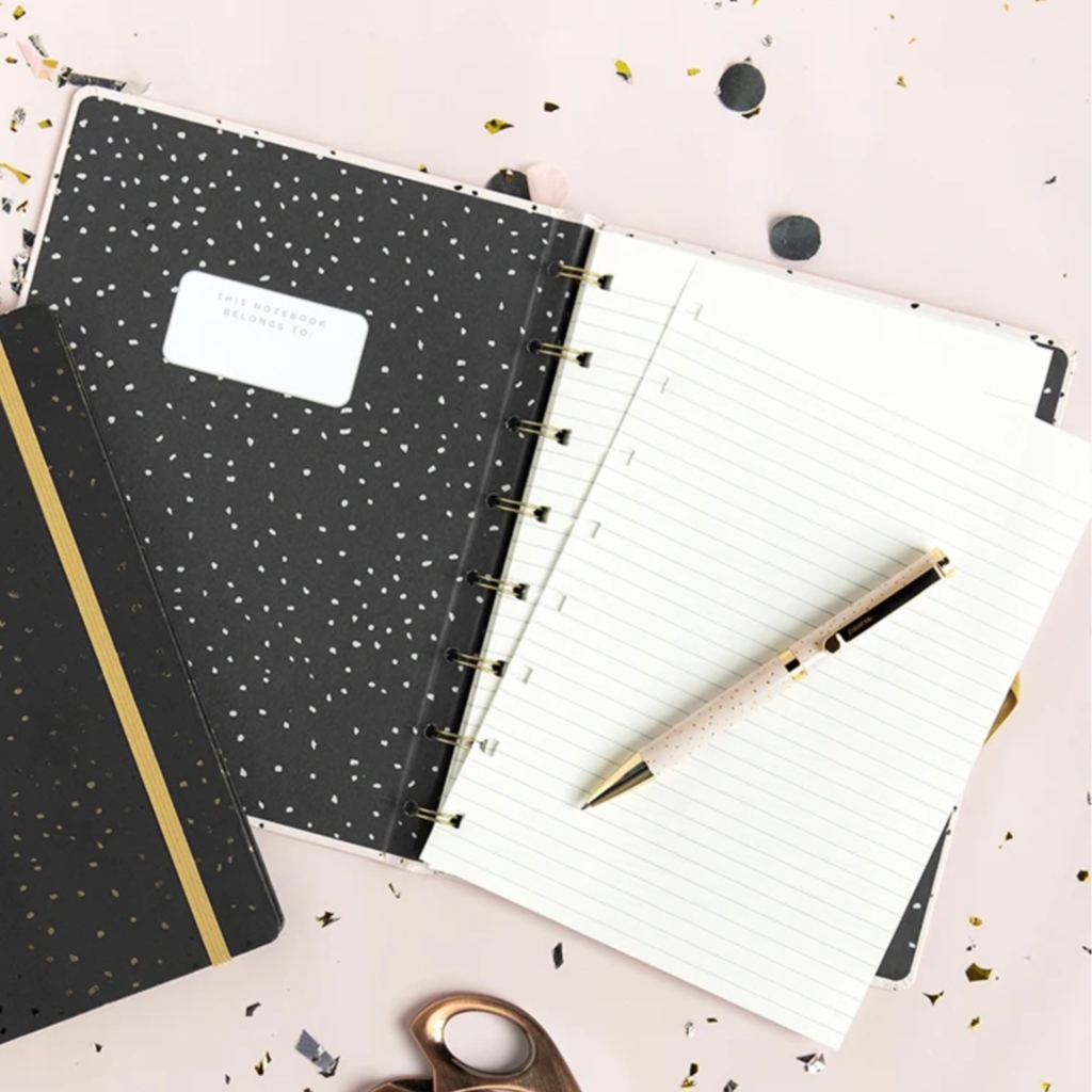 Haz que cada día sea especial con este cuaderno recargable A5 de nuestra colección Confetti, que cuenta con cubiertas de cartón laminado con detalles en dorado e interiores estampados. Su encuadernación de doble alambre dorado permite que se doble sobre sí mismo y se posicione perfectamente plano cuando está abierto, y un cierre elástico que combina con el color ayuda a mantener todo en su lugar. Incluye papel rayado apto para pluma estilográfica. Las páginas son reposicionables y recargables, lo que le permitirá crear el cuaderno que realmente se adapte a sus necesidades.